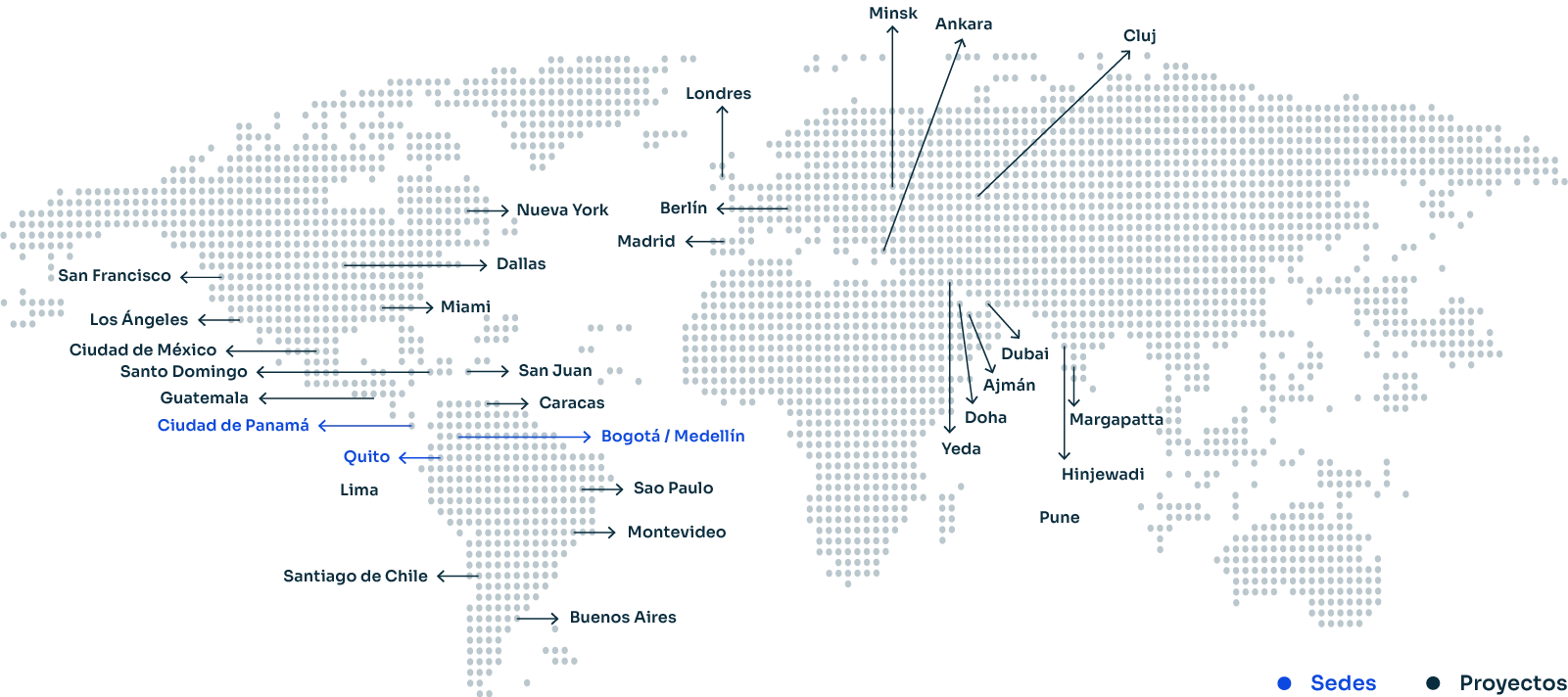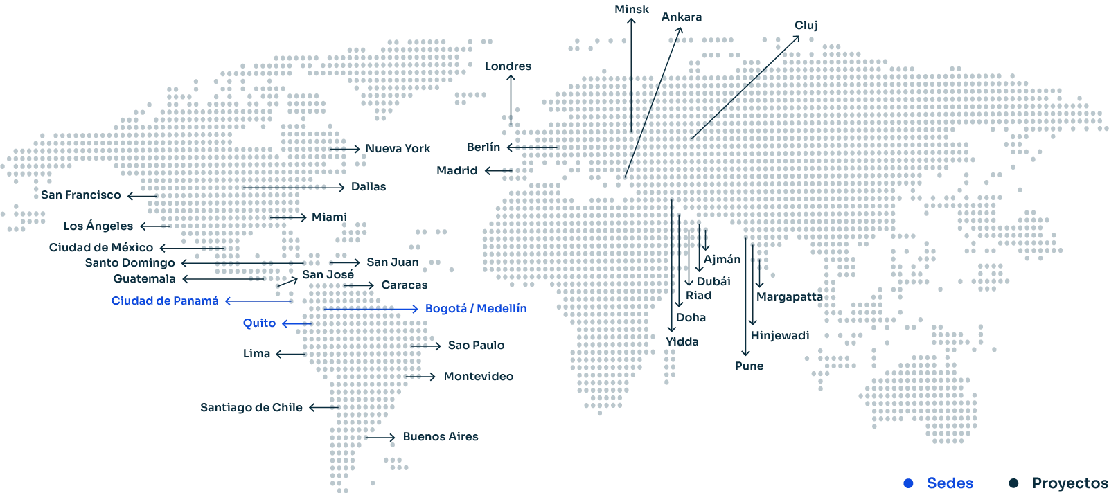 diseñados y construidos.Tenemos proyectos en más de 15 países, 3 continentes y oficinas en 4 ciudades (Bogotá, Medellín, Panamá y Ecuador).