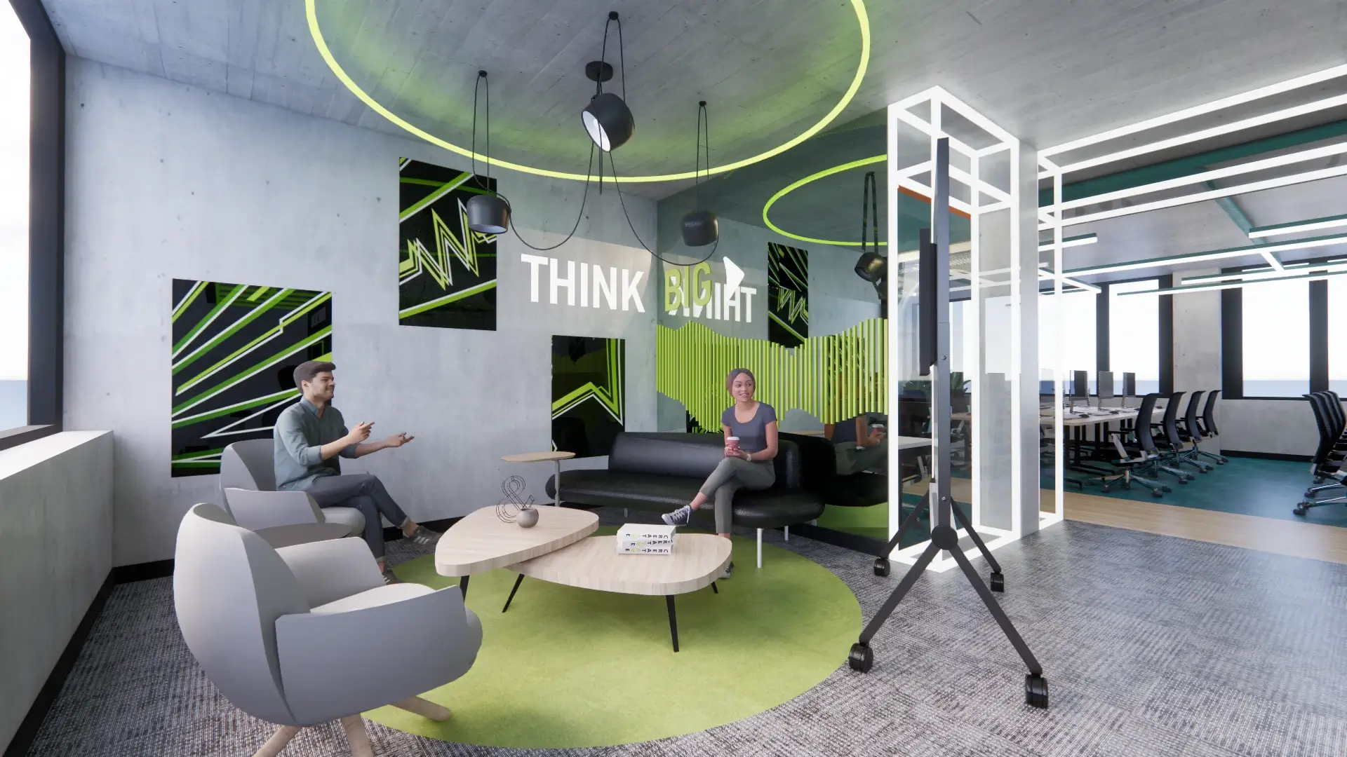 El look&feel y concepto del proyecto se manifiestan en el uso de materiales crudos como el vidrio, el metal, la madera, y el concreto, el cual se encuentra de forma prominente en el espacio debido a los muros y la placa existentes del edificio. Se usaron colores brillantes como el turquesa, verde, y rojo para crear contraste con los materiales puros, los cuales tienen tonos más neutros naturalmente. Además, se usaron elementos de vidrio en lugar de re engrueses de drywall para dar más enfoque a la estructura verdadera del edificio.