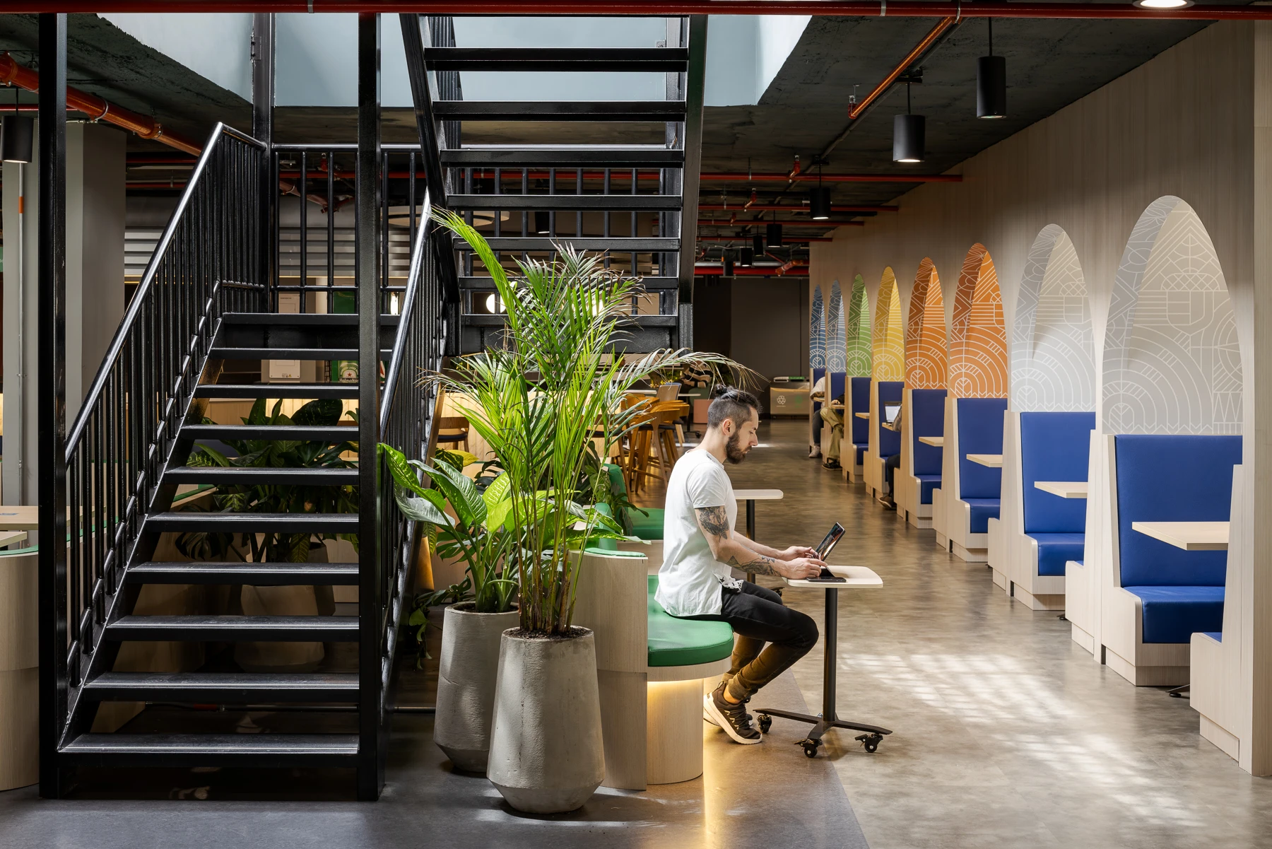 - La paleta de colores expresa una serie de colores cálidos que logren conceptualizar la arquitectura de la ciudad, la cual se expresa con una serie de colores fríos representando la vegetación que tanto logra verse en Medellín lo que permite complementarse ambos y logren crear una armonía en el espacio a través de la representación de dichos colores